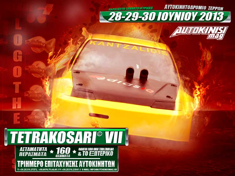 Σας παραθέσαμε τα 10 γρηγορότερα αυτοκίνητα του TETRAKOSARI VI, και σας δώσαμε την δυνατότητα να ψηφίσετε ποιο από αυτά είναι το αγαπημένο σας, εδώ. Μετά από 1100 περίπου ψήφους (!) επιλέξαμε τα τρία πρώτα αυτοκίνητα ώστε να πρωταγωνιστήσουν σε τρεις συλλεκτικές αφίσσες για το έβδομο ΤΕΤΡΑΚΟΣΑΡΙ που πρόκειται να γίνει στο αυτοκινητοδρόμιο των Σερρών, στις 28, 29 και 30 Ιουνίου 2013. Εσείς δημιουργήσατε τις αφίσσες.. θα χάσετε το τριήμερο; Δηλώστε παρών στην εκδήλωση μας στο facebook.